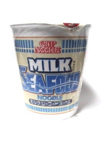 これは非常に有名な「シーフードヌードル」のカップラーメンに、お湯の代わりに牛乳を入れるとンマ〜イ!(トキワ荘風)という噂を商品化してしまったものです。